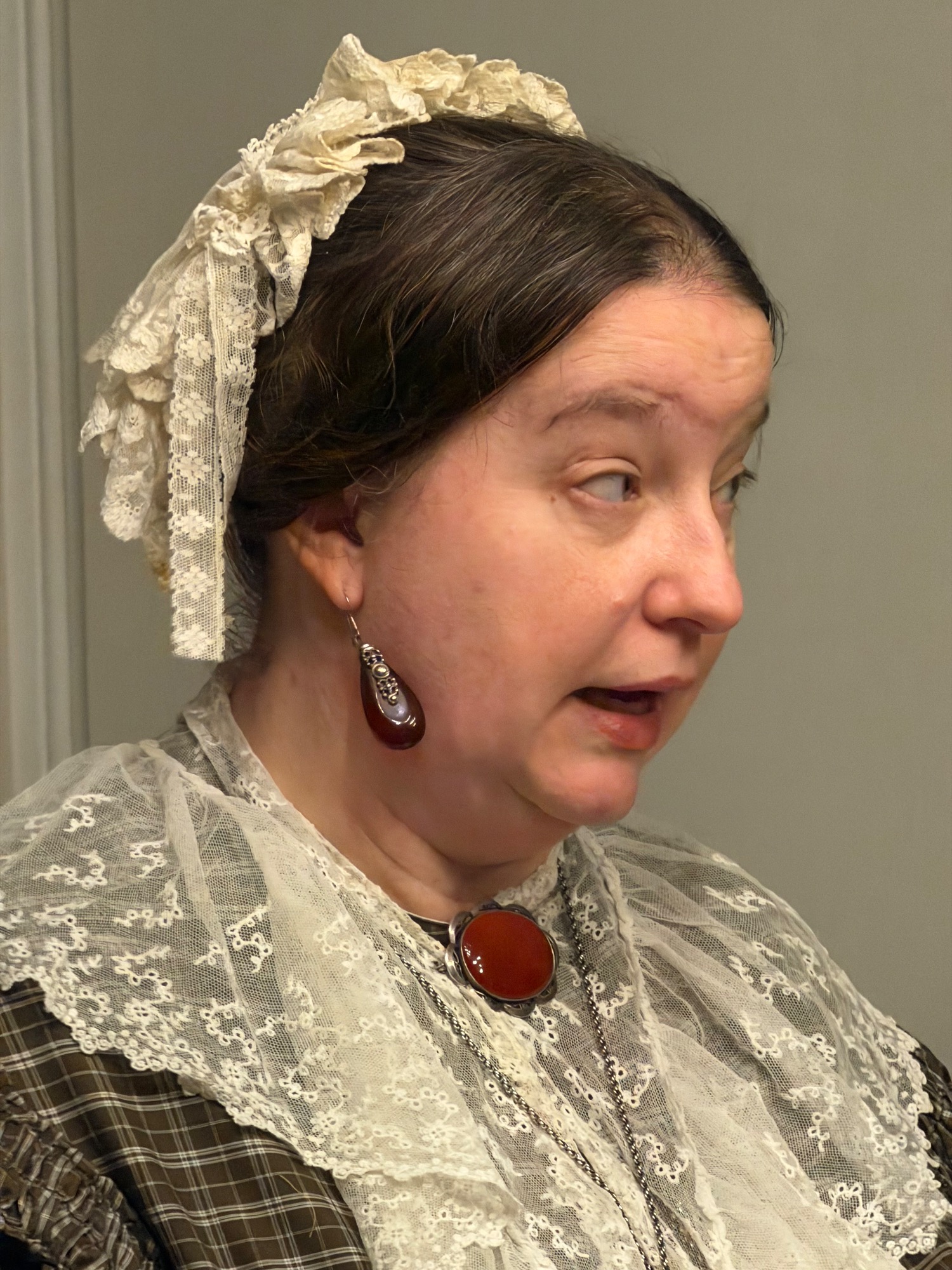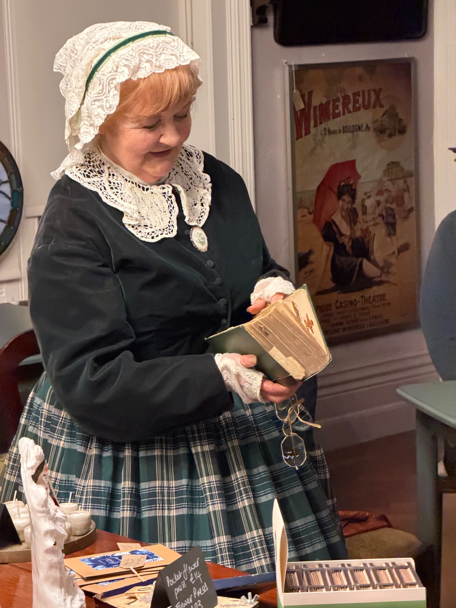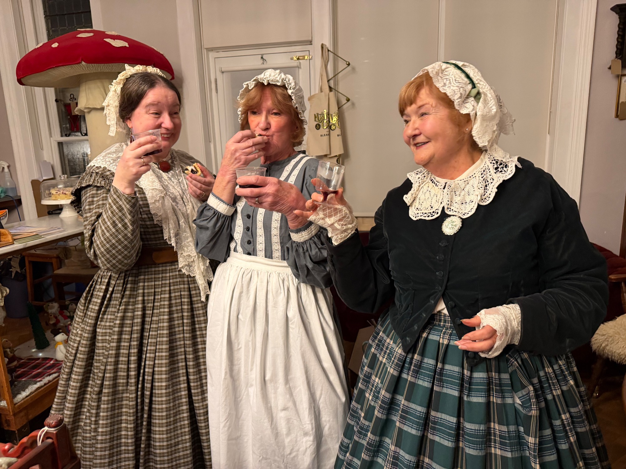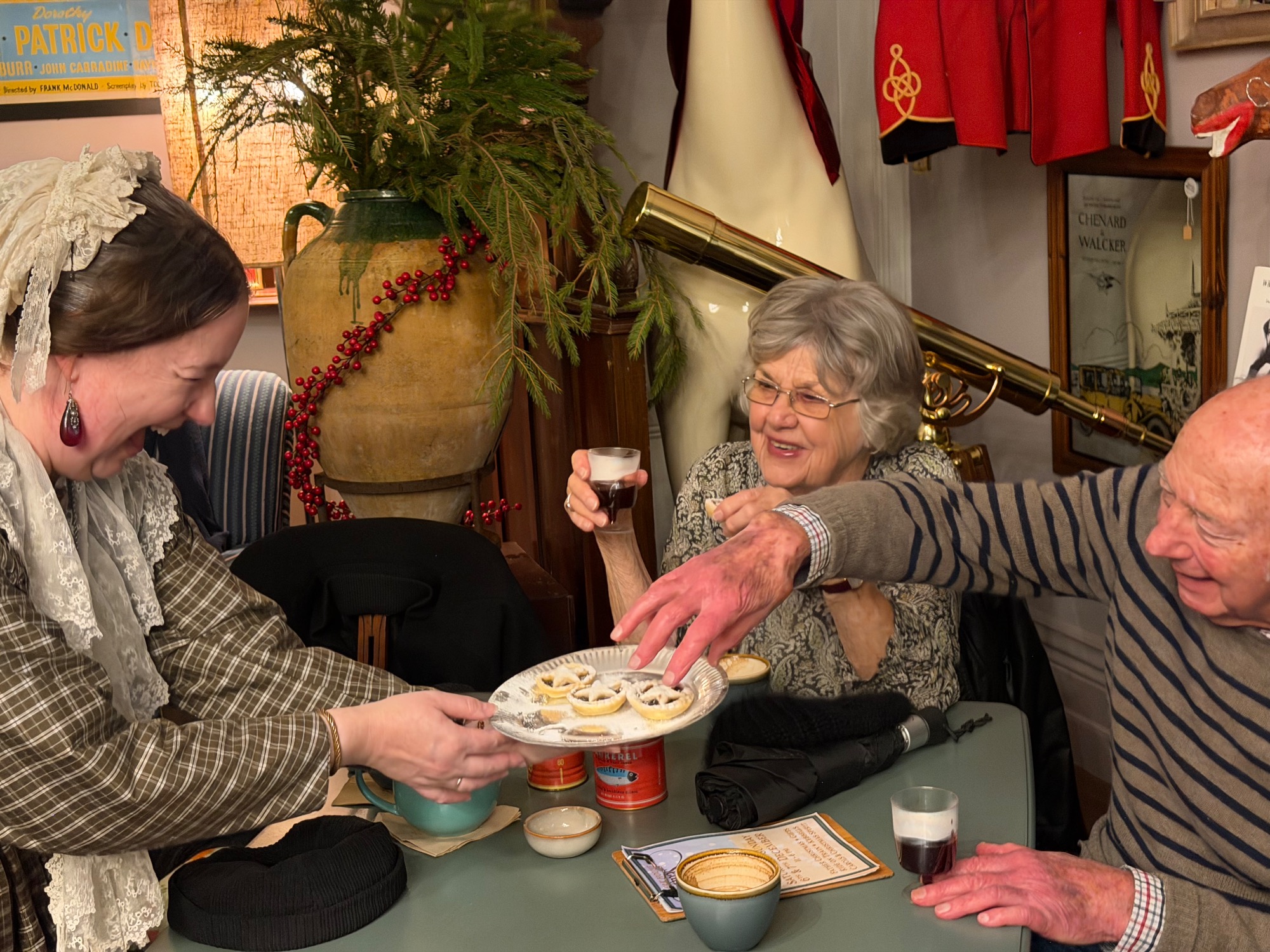 The meeting was held, appropriately, in the Havisham and Cratchit coffee shop at Bleak House. Mrs Beeton was there and had brought along her maid Hannah (a.k.a. Tessa Coulson) and there was a surprise visit from Queen Victoria (a.k.a. Louise Stubbings). Mrs Beeton told all about Smoking Bishop and how it was made and then Hannah and Queen Victoria handed out glasses of Smoking Bishop and mince pies for us all to taste.